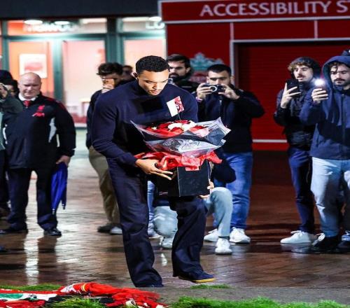 利物浦歐冠主場對陣皇家馬德里歐冠前夕,前利物浦后衛(wèi)阿諾德到安菲爾德若塔紀(jì)念碑前獻(xiàn)上鮮花、游戲手柄和手寫卡片。