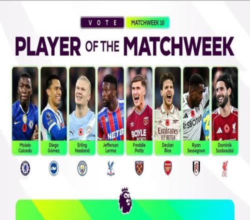 北京時間11月4日,英超官方公布了第10輪比賽的最佳球員候選名單,其中賴斯、哈蘭德、索博斯洛伊、凱塞多等人在列。